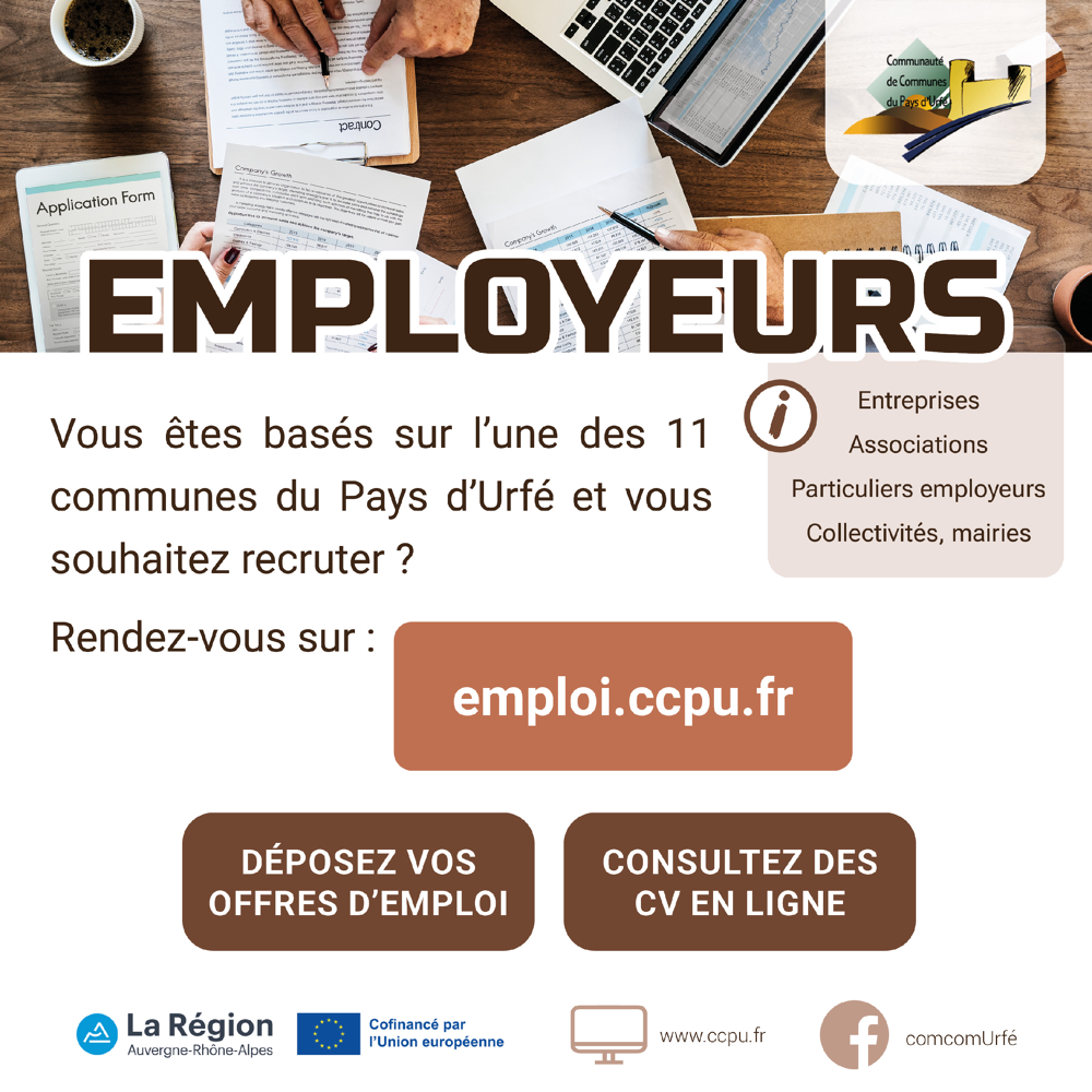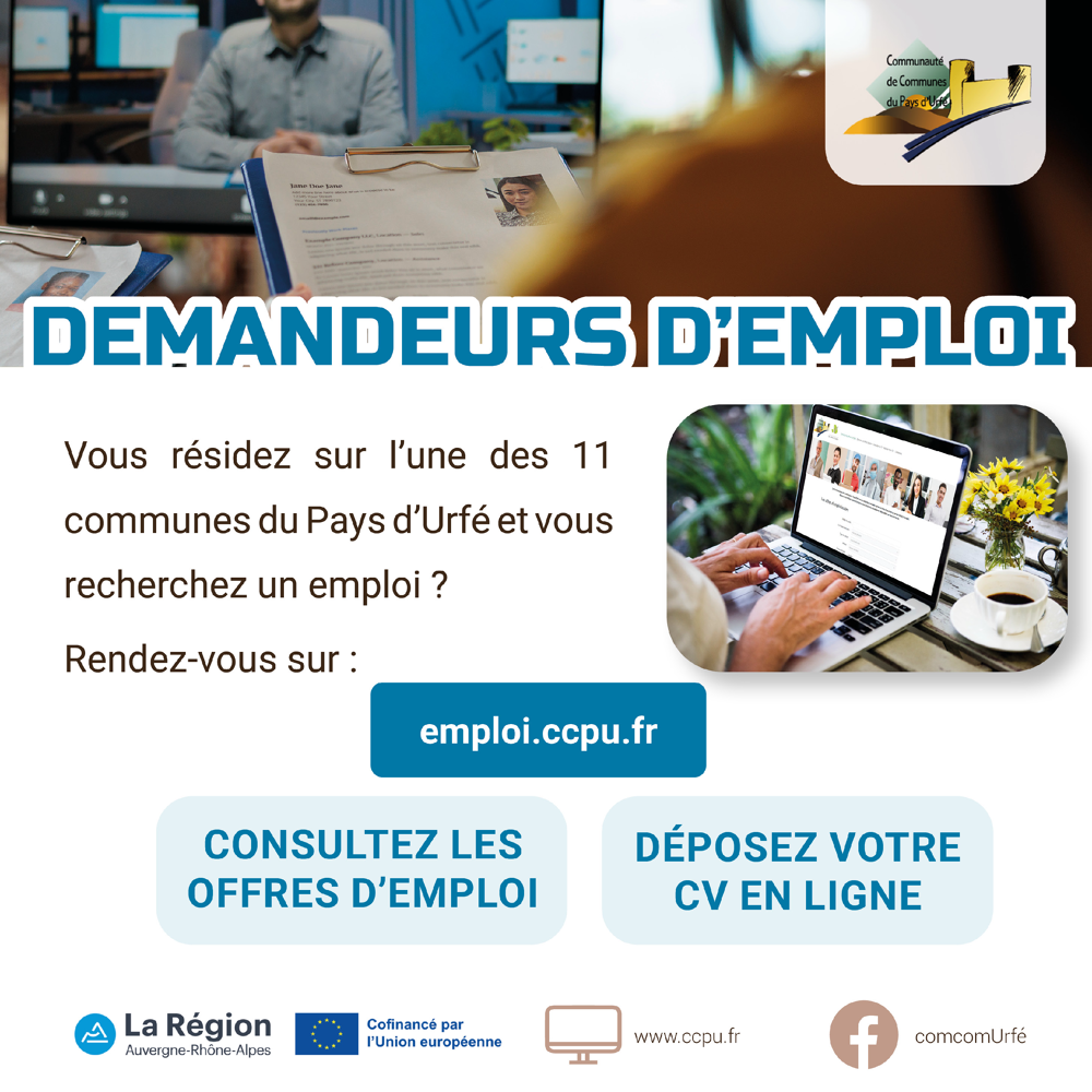 La Communauté de Communes du Pays d’Urfé met à disposition des employeurs et demandeurs d’emplois un nouvel outil gratuit et simple d’utilisation : Employeurs : déposez vos offres d’emplois pour plus de visibilité locale et consulter la CVthèque Demandeurs d’emplois : déposez votre CV anonymisé et consulter les offres Un seul lien : emploi.ccpu.fr [http://emploi.ccpu.fr] Besoins d’informations ? Contactez le 06.60.96.24.55